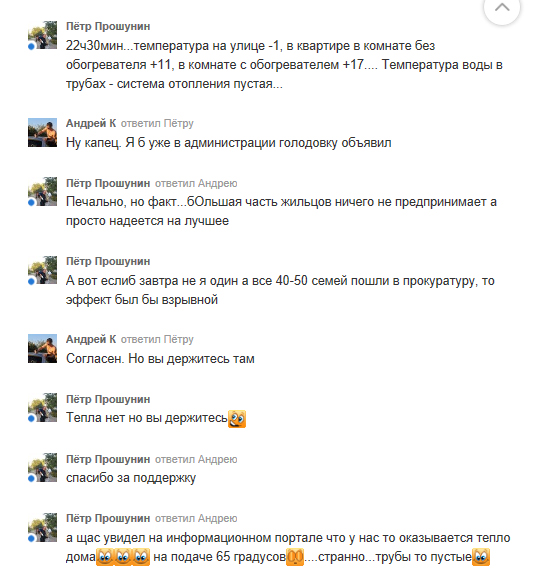Через час на сайте горадминистрации появилась куда более красочная информация: «В настоящее время параметры теплоносителя составляют на подаче 65, на „обратке“ 40º С». Горожан ситуация возмутила, они назвали сообщение на сайте неприкрытым враньем. «14:30… температура на улице +1º С, в квартире в комнате без обогревателя +12º С, в комнате с обогревателем +17º С… Температура воды в трубах +13º С, температура на поверхности батареи +15º С», — привел реальные параметры один из горожан. «Я бы на вашем месте позвонил в администрацию и спросил, какого… они такую ложь размещают», — посоветовал другой пользователь. «Завтра иду писать второе заявление в прокуратуру. Не знаю, поможет ли, но если сидеть дома, то лучше не станет», — ответил первый комментатор.