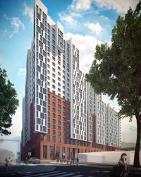 «Вход в торговую галерею, общий вид комплекса. Работаем над дизайн-кодом», — прокомментировал фотографии архитектор. Как видно, ЖК точно станет архитектурной доминантой окрестного района: об этом говорит и его высота, и используемые цветовые решения. Причем здание выглядит спроектированным с учетом концепции конструктивизма: дизайн предполагает не только прямые, но и острые углы, плавную смену этажности и т. п.