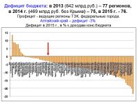 Главный фактор кризиса понятен — это завершение старой модели роста. При нынешних институтах экономика больше расти не может даже при высоких ценах на нефть. Какие болевые точки у страны? В первую очередь — бюджет. Проблемы уже начались у регионов. В 2013 году 77 регионов имели дефицит, в 2014 году — 75, в 2015 году — 76. И Алтайский край среди них. Причины хорошо известны. Первые два года — это указы президента о повышении заработной платы, что легло дополнительной ношей на экономику регионов. И одновременно их доходы начали уменьшаться. Регионы не справились с задачей сделать всех «белыми, пушистыми, красивыми». 2015 год — это еще и кризис федерального бюджета. Дефицит составил 2 трлн рублей, а дальше будет хуже.