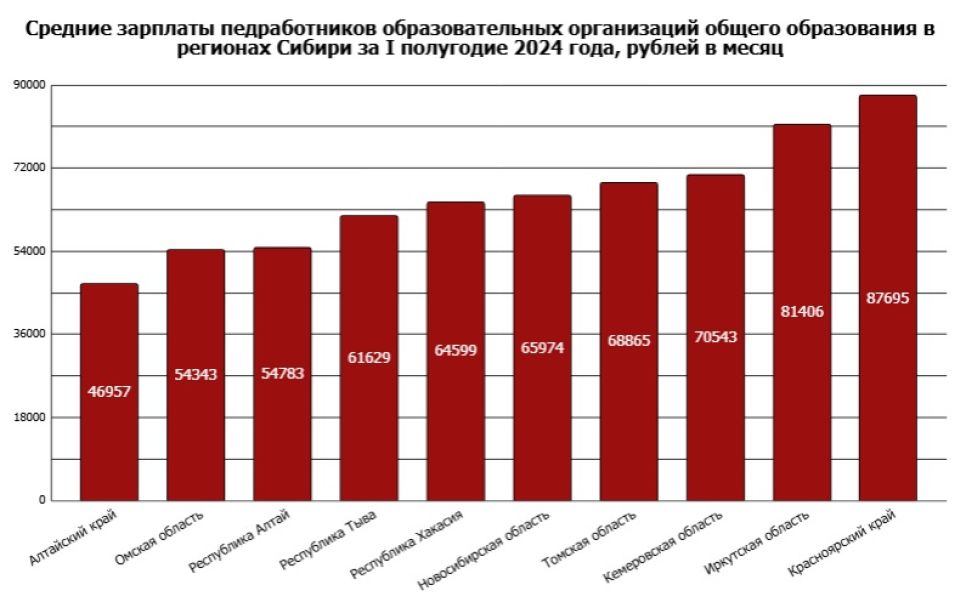 В целом алтайские учителя зарабатывают почти на 35% меньше, чем их коллеги в среднем по РФ. Регион занимает 15-е место с конца, обгоняя лишь субъекты Северного Кавказа и несколько областей центральной России — в Ингушетии, Чечне, Карачаево-Черкесии и Дагестане педагоги общего образования вовсе получают меньше 40 тысяч рублей. Лидерами же в стране являются регионы Дальнего Востока и нефтедобывающие субъекты Крайнего Севера, а также Москва.