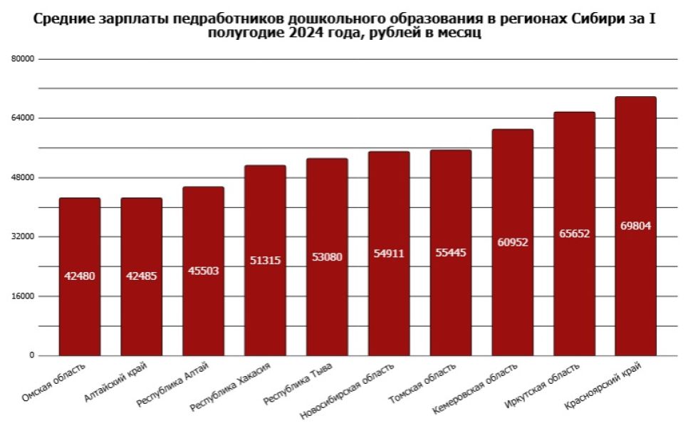 Как отмечают в Росстате, средняя заработная плата в сфере общего образования в Алтайском крае за январь-июнь 2024 года составила 42 749 рубля — последнее место за Уралом и на 21 828 рублей или более чем на треть меньше, чем в среднем по России.