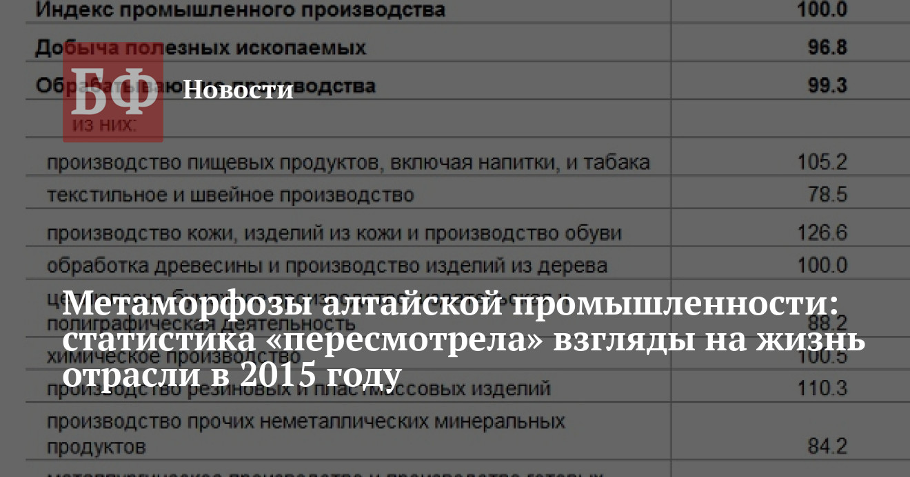 Тем временем, по уточненным данным, алтайской промышленности все же не удалось удержаться в прошлом году в положительной зоне (100%), как ранее настаивали представители профильных отраслей региональной экономики. Согласно уточненным данным Новосибирскстата, на деле падение в алтайской экономике составило 1,3%, что является худшим результатом по СФО за исключением Тывы (2,1%). К слову, как одно и так другое статведомство при подсчете использовало так называемые оперативные данные. При этом крайстат разместил информацию об итогах года 25 января, Новосибирскстат — 15 февраля. Чуть позже Новосибирскстат сообщил, что опубликованные данные были ошибочными и правильно считать индекс промышленного производства по Алтайскому краю 100%.Добавим, крайстат на постоянной основе фиксирует тренд на снижение ключевых индикаторов в алтайской промышленности именно в начале календарного года. Так, ранее уровень промпроизводства в регионе опускался до 95,6% (январь 2015 года по отношению к январю 2014-го).