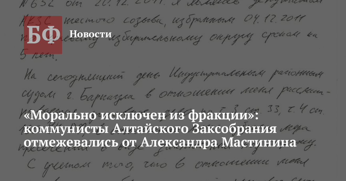Депутат Алтайского Заксобрания Александр Мастинин, являющийся подсудимым по уголовному делу, потерял право называться коммунистом. Он уже около полутора лет исключен из партии, а к фракции КПРФ в Заксобрании имеет лишь формальное отношение. Такую позицию ИА «Банкфакс» высказал руководитель фракции Виталий Сафронов, комментируя неожиданное письмо своего коллеги.