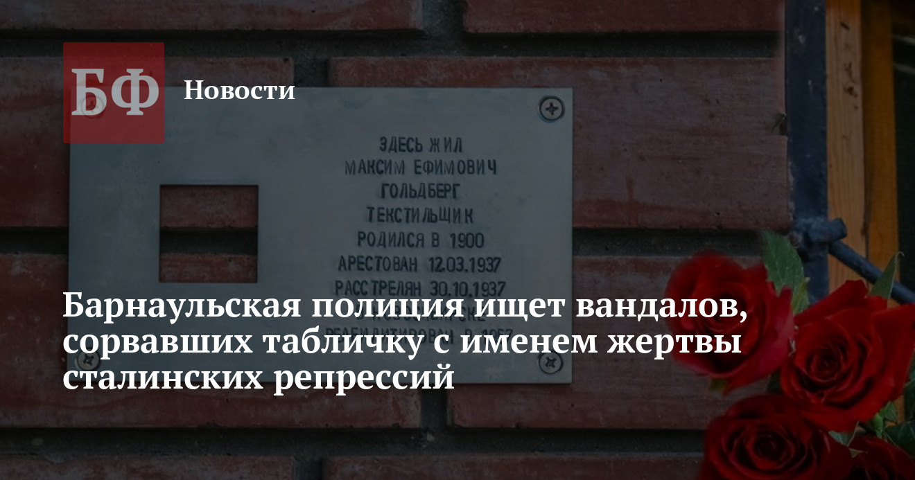 Барнаульская полиция начала поиск злоумышленников, которые сорвали памятную табличку с именем жертвы сталинских репрессий, бывшего директора Барнаульского меланжевого комбината Максима Гольдберга. Памятный знак украли всего через два дня после установки в рамках всероссийской акции «Последний адрес», не исключено, что так произошло не случайно. Об этом ИА «Банкфакс» рассказал общественник Виктор Рау.