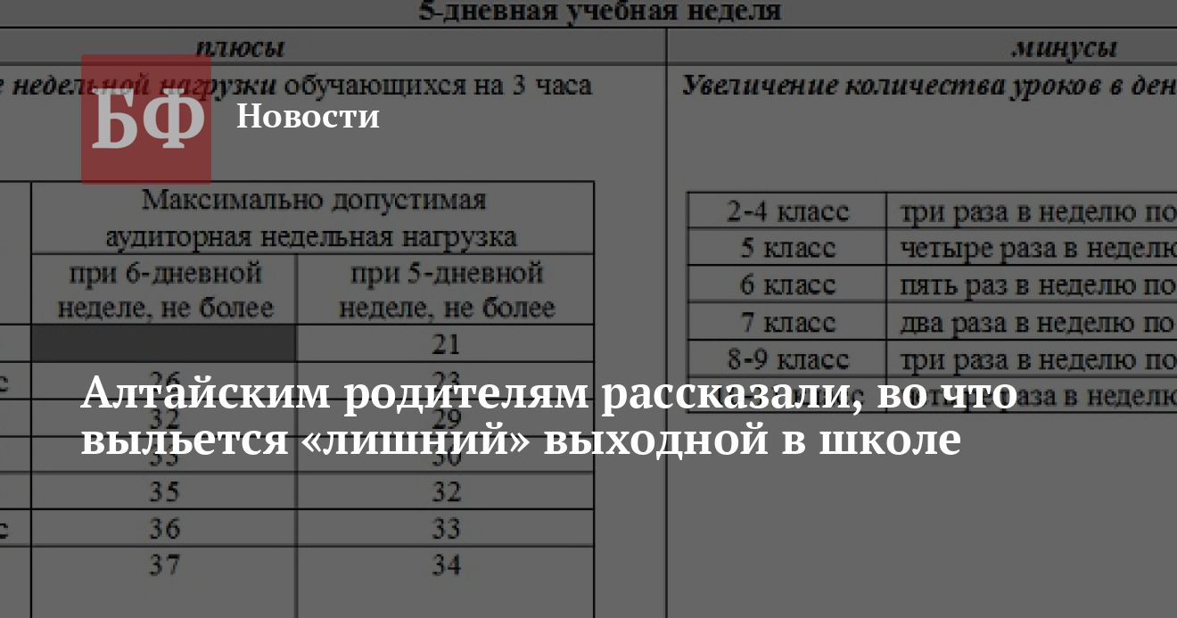 Возможный переход алтайских школ на пятидневную рабочую неделю может привести к тому, что уже с седьмого класса в расписании учащихся будет фигурировать по семь уроков, а на углубленное изучение предметов в гимназиях и лицеях попросту не хватит времени. Такие выводы содержатся в материале, подготовленном региональным Главуправлением образования и молодежной политики.