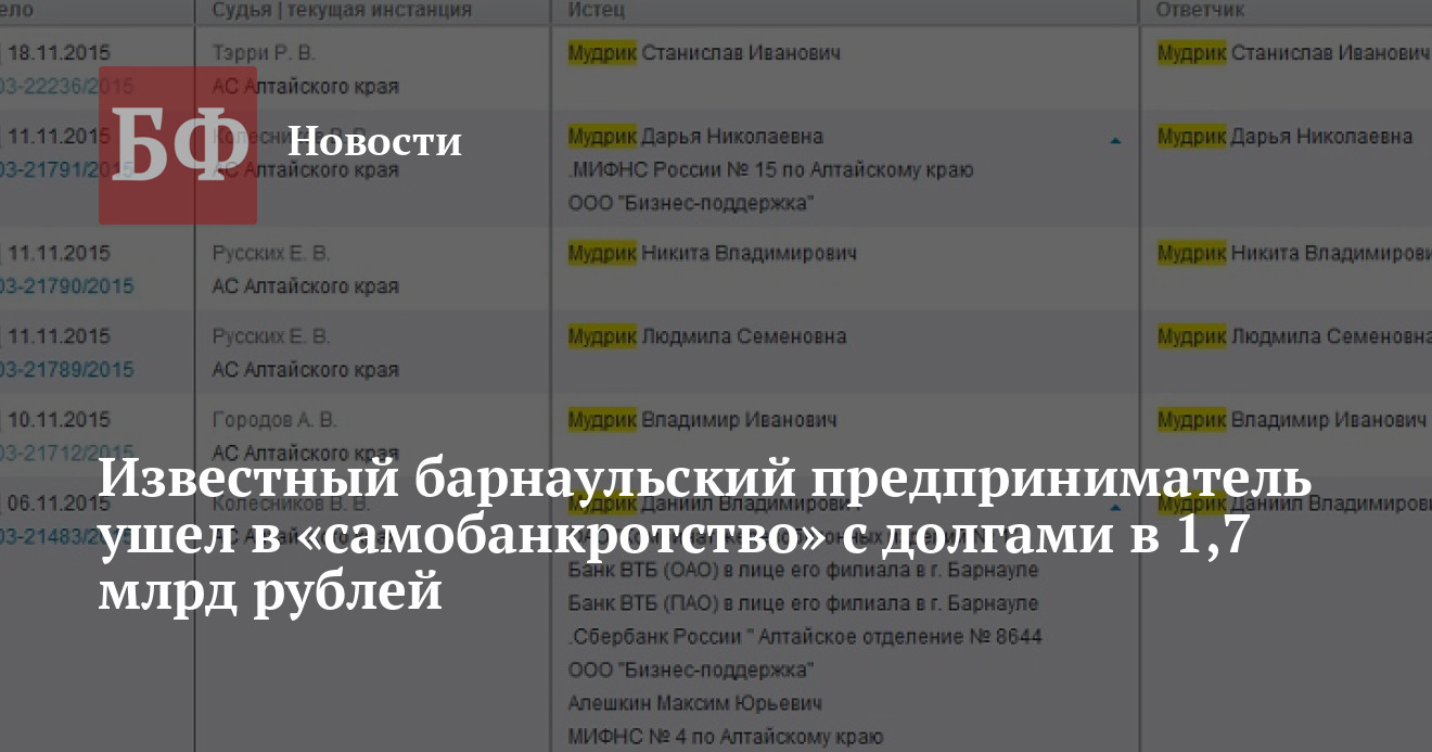 Как следует из картотеки краевого арбитражного суда, требования о банкротстве г-на Мудрика были удовлетворены 9 марта. Судом установлено, что общий размер требований кредиторов к должнику составлял 1,764 млрд рублей. Финансовые претензии предъявили «Форбанк», «Банк ВТБ», Сбербанк и ФНС России.