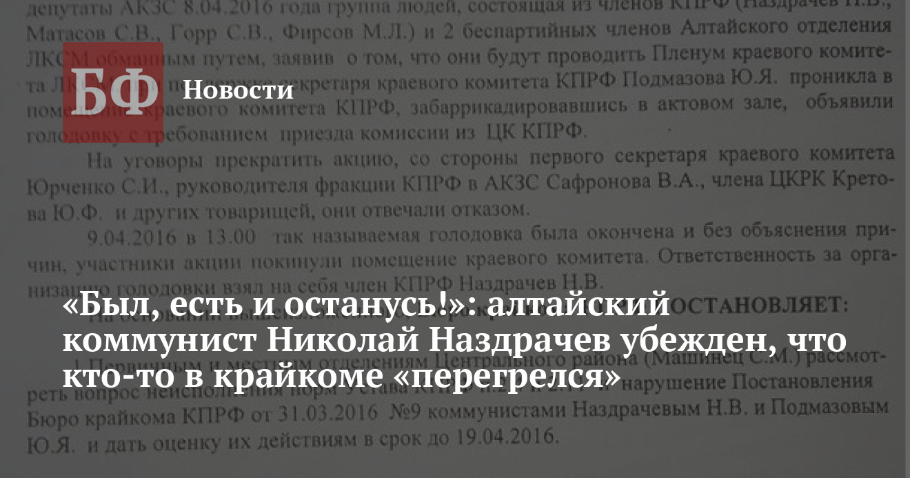 , есть и останусь!": алтайский коммунист Николай Наздрачев убежден, что кто-то в крайкоме «перегрелся»"