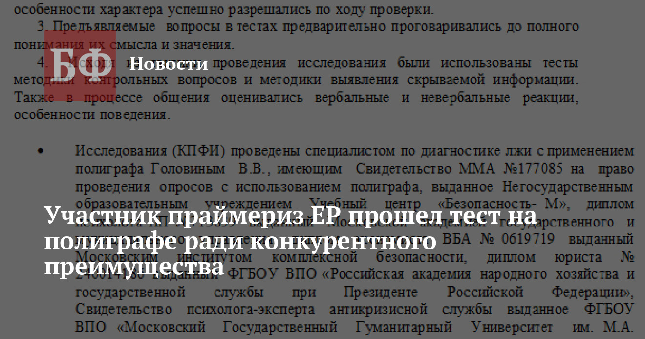 По словам г-на Нагайцева, он предлагал сделать процедуру обязательной еще в 2010 году, но тогда, как и сейчас, власти не прислушались к его мнению. Тем не менее потенциальный соискатель думского мандата продолжает педалировать эту тему. Несколько недель назад он сам прошел тест на полиграфе и теперь указывает этот факт как свое преимущество перед другими участниками предварительного голосования.