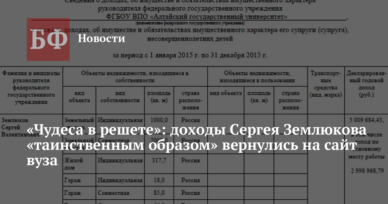 Однако 18 мая сведения вновь появились на сайте госуниверситета, хотя и с некоторыми «косметическими» правками. Так, доходы ректора АлтГУ, равно как и руководителей филиалов классического университета теперь представлены шестью отдельными файлами, а не единым сводным документом, как раньше. Кроме того, в данные Сергея Землюкова была внесена небольшая корректировка: в сумме его дохода в 2015 году (5,009 млн рублей) был выделен доход по основному месту работы, составивший две трети от всего заработанного — 2,998 млн рублей. Происхождение оставшихся 2,01 млн рублей остается неясным. Кстати, аналогичного уточнения в отношении директоров филиалов вуза в этом плане сделано не было.