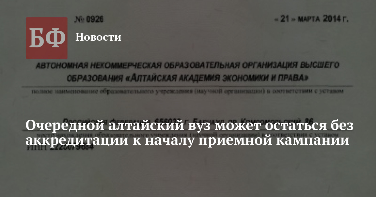 ААЭП далеко не первый алтайский вуз, столкнувшийся в текущем году со сложностями при прохождении аккредитации. Так, в феврале в НОУ ВПО «Алтайский экономико-юридический институт» было полностью приостановлено действие госаккредитации. Тем временем затрудения с разрешительными документами продолжает испытывать один из флагманских вузов региона — Алтайский государственный технический университет им. И. И. Полузнова. Срок старой госаккредитации истек 25 апреля, а новую вуз еще не получил. Согласно заверениям прежнего руководителя «политеха» Александра Ситникова, аккредитация могла быть получена в течение месяца. Однако до сих пор этого не произошло, более того, такая медлительность стоила кресла самому г-ну Ситникову. Публичный разнос на тот момент ректору АлтГТУ устроил министр образования Дмитрий Ливанов.
