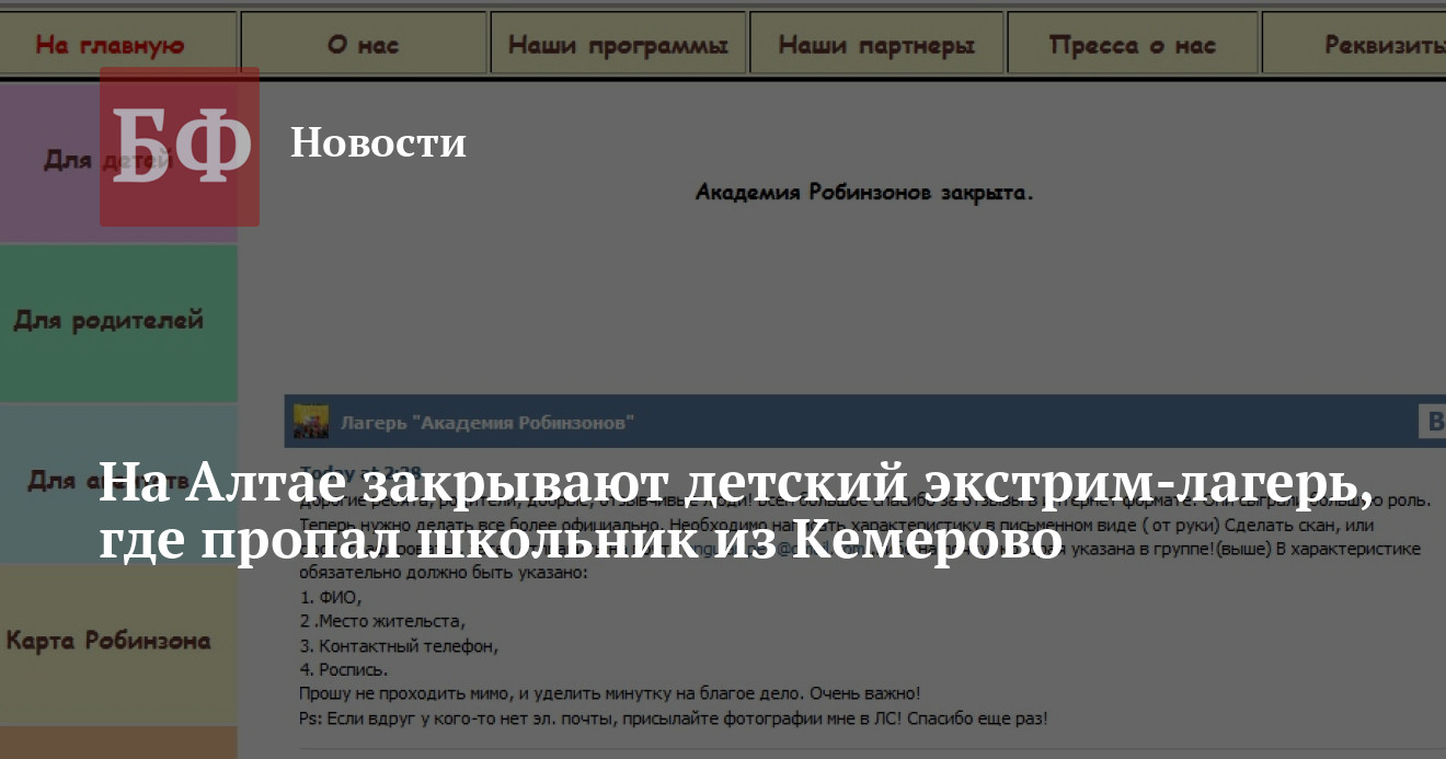 Частный детский лагерь «Академия робинзонов» на берегу Катуни, в котором произошел несчастный случай с 13-летним мальчиком из Кемерова, закрылся. Судя по сообщению на сайте лагеря, это личное решение помещенного под домашний арест по ходатайству следствия директора Анатолия Шульжика.