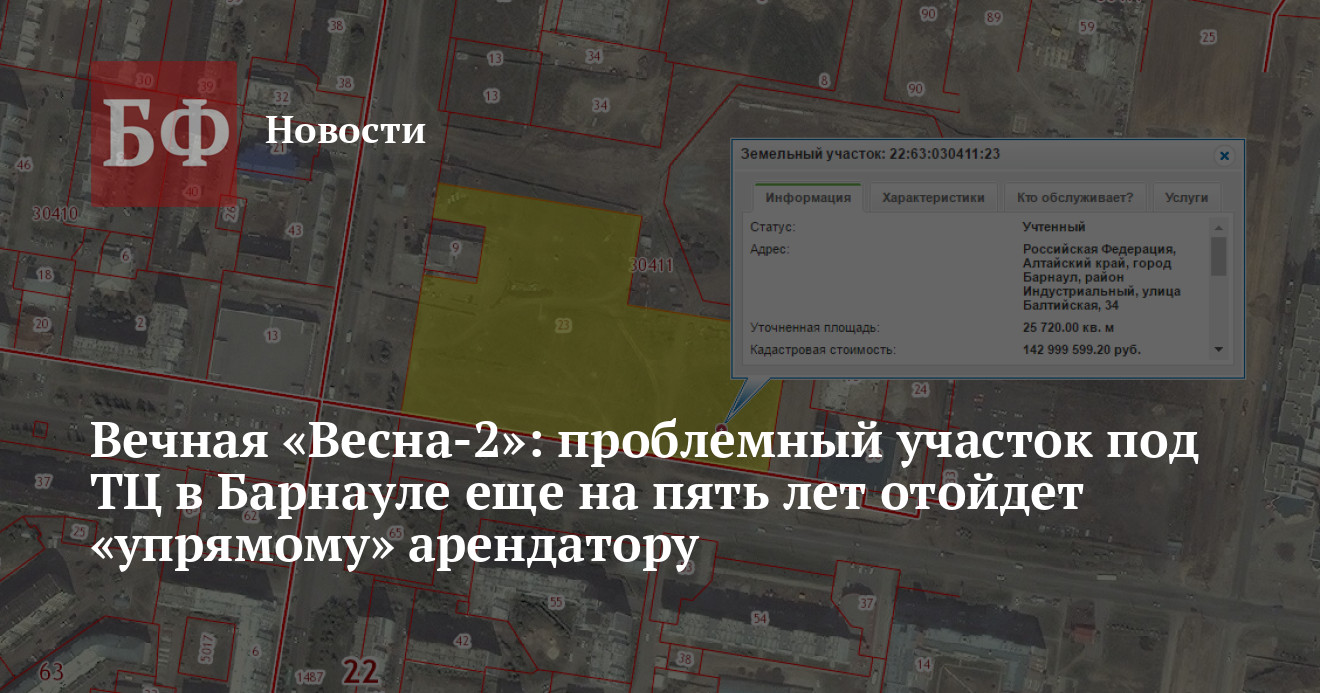 21 июля Фонд имущества Алтайского края подвел итоги аукциона на право аренды земельного участка по улице Балтийской, 34 — на перекрестке с улицей Шумакова, где уже много лет огорожена стройплощадка под ТРЦ «Весна-2». Лучшее предложение сделало ООО «ИМИ», которое арендует эту землю с 2008 года «под инвестора» — московскую компанию «Финстрой» (до 2009 года — Finstar Properties). По итогам аукциона стройплощадку зарезервировали еще на пять с половиной лет.
