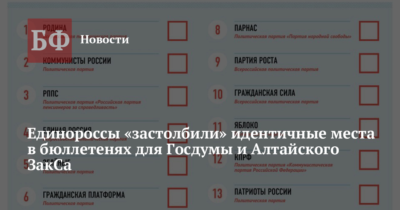 За месяц до дня голосования по выборам в Госдуму и Алтайское Заксобрание наконец наступила ясность с тем, какие партии окажутся в избирательных бюллетенях. Более того, уже стал известен и порядок расположения политобъединений «на бумаге». По сравнению с прошлым парламентским циклом за места в российском парламенте поборется вдвое больше партий: 14 вместо семи, прирост по АКЗС вышел не столь заметным — к четырем действующим игрокам добавилось лишь «Яблоко».