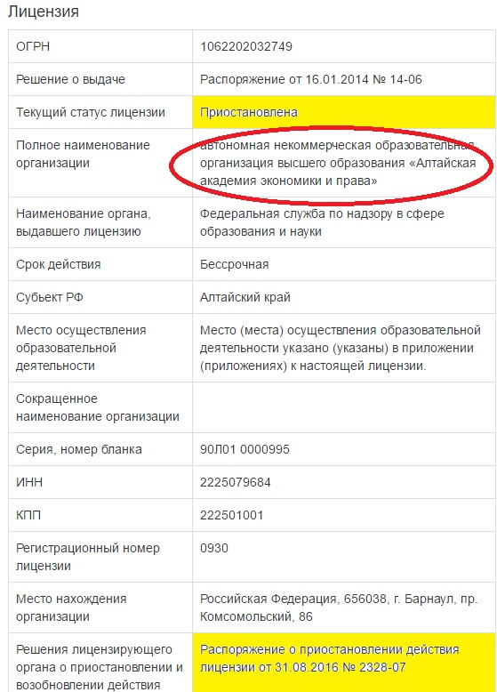 ...Алтайская академия экономики и права, которая, по уверениям ректора Александра Тена, должна была в течение осени вернуть аккредитацию, похоже, имеет все шансы прекратить существование... а как быть с теми кто уже купил дипломы этого заведения - они уже рабатают в Славгороде - судьями, прокурорами, полицаями, следователями, СПИ и т. д. Ране по делу у судьи Шполтаковой И Н я считал, что СПИ ОСП г Славгорода, Бурлинского и Ненмецкого Национальных районов Головенко П В купил в метро НСК, оказывает нет - оказывается 11 июня 2008г в Автономной НЕКОММЕРЧЕСКОЙ организации высшего профессионального образования "Алтайская академия экономики и права (институт)"