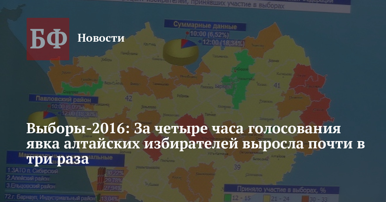 По данным источника, наибольшая явка по-прежнему наблюдается в ЗАТО «Сибирский» — более 30%, и в Белокурихе — более 25%. Среди сельских поселений наиболее активно к обеденному времени голосуют в Новичихинском районе, где на выборы пришли 27% избирателей, а также в Угловском и Родинском районах, где явка составила более 25%. В городских округах показатели более скромные: в Бийске проголосовало чуть более 12% граждан, в Барнауле — более 13%.