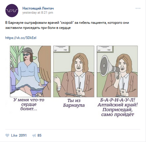 Центральный районный суд Барнаула обязал Станцию скорой медицинской помощи выплатить местной жительнице компенсацию в 300 тысяч рублей после гибели ее мужа вскоре после отъезда врача. Медики заставили пациента, жаловавшегося на боль в сердце, приседать, говорится в сообщении правозащитной организации «Зона права». Этот случай вызвал резонанс в российском Интернете и бурные обсуждения в крупнейших новостных сообществах в соцсетях.