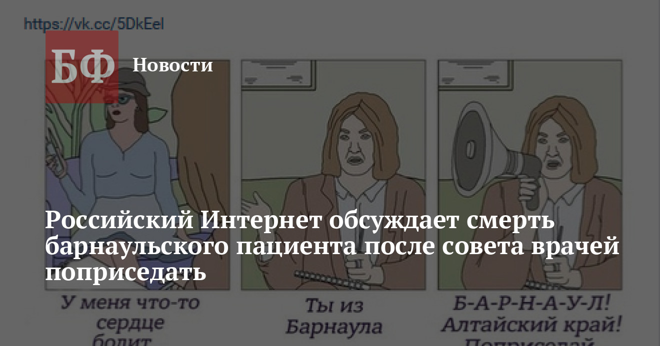 Центральный районный суд Барнаула обязал Станцию скорой медицинской помощи выплатить местной жительнице компенсацию в 300 тысяч рублей после гибели ее мужа вскоре после отъезда врача. Медики заставили пациента, жаловавшегося на боль в сердце, приседать, говорится в сообщении правозащитной организации «Зона права». Этот случай вызвал резонанс в российском Интернете и бурные обсуждения в крупнейших новостных сообществах в соцсетях.