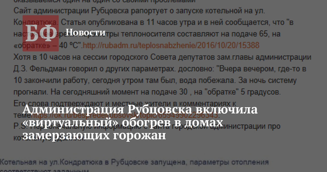 Очередной скандал разгорается в Рубцовске, где местные власти до сих пор не могут полноценно войти в отопительный сезон, который по документам должен был начаться еще в первых числах октября. 20 октября горадминистрация на своем сайте разместила сообщение об успешном запуске муниципальной котельной на улице Кондратюка в поселке Западном, но была вынуждена удалить сообщение после того, как возмущенные местные жители уличили чиновников в неприкрытом вранье о параметрах теплоносителя. Ситуацию обсуждают в сообществе «Беспредел нашего города — обратная сторона Рубцовска» в «Одноклассниках».