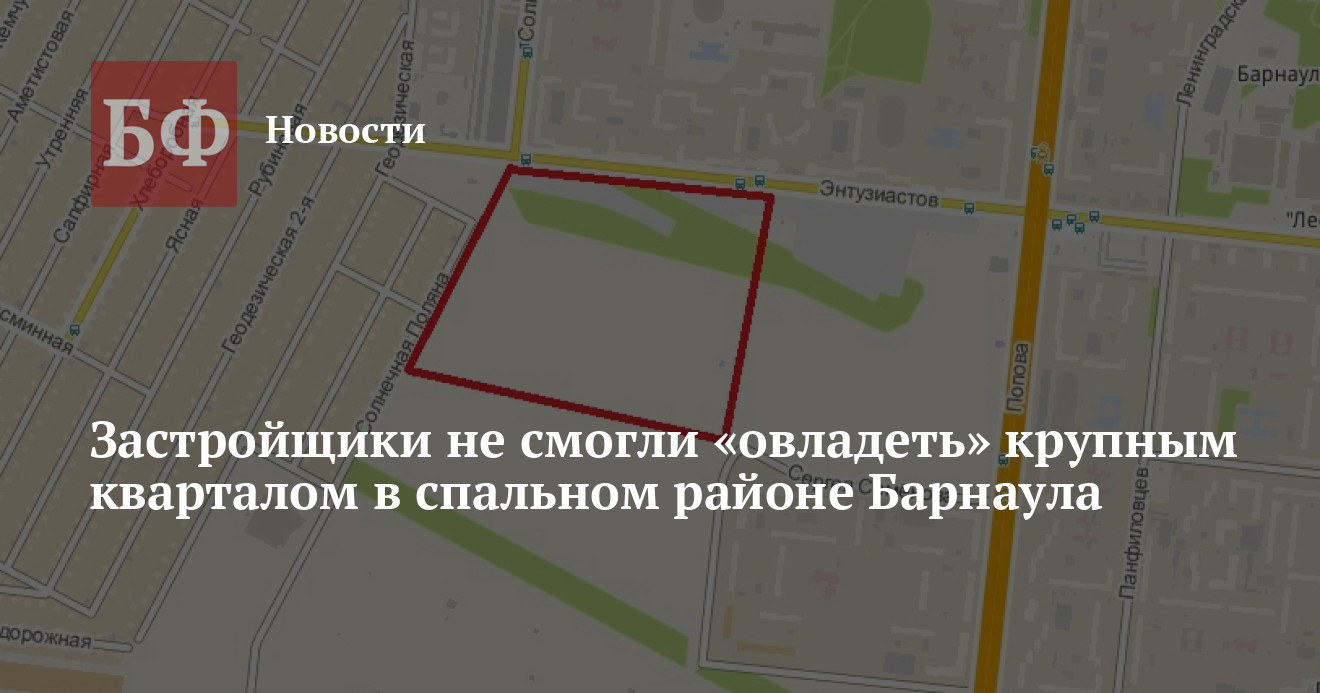 Согласно проекту, который предоставила городская администрация, в квартале 2032 в границах улиц Энтузиастов, Солнечная поляна, Сергея Семенова и 65 лет Победы, помимо жилых домов, должны были появиться детский сад на 140 мест, средняя школа на 1296 мест и детская поликлиника. Администрация Барнаула планировала, что здесь будет построено 173 469 кв. м жилья. Предполагалось, что аукцион будет интересен сразу нескольким крупным застройщикам, однако в итоге он не состоялся из-за отсутствия заявок.