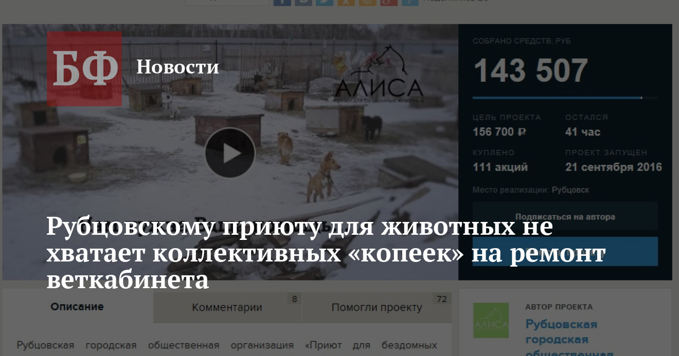 Приют для животных «Алиса», расположенный в Рубцовске, в конце сентября запустил краудфандинговую кампанию по сбору средств на ремонт ветеринарного кабинета, кухни и комнаты для волонтеров. К началу ноября искомая сумма на сайте planeta.ru почти достигнута, но если за ближайшие пару дней не удастся собрать еще 13 тысяч рублей, все усилия пойдут прахом.