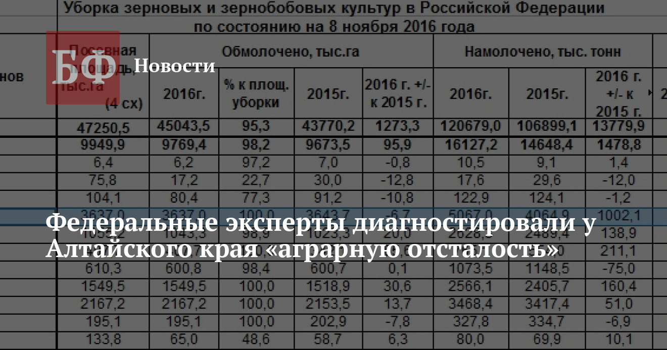 Общие и самые свежие данные по России привел министр сельского хозяйства Александр Ткачев. «Последние данные этих часов: в 2016 году в России будет собрано более 117 млн тонн зерна, экспорт зерновых культур, по нашим прогнозам, достигнет 35 млн тонн, Россия при этом сохранит лидерство по поставкам пшеницы, обойдя таких крупных поставщиков, как ЕС и США. Это лучший урожай зерна за последние 38 лет (в 1978 году — 127 млн тонн). Таких результатов удалось добиться за счет роста урожайности, которая за эти годы увеличилась на 60% — с 17 до 27 центнеров с гектара. Есть зерно — есть хлеб, есть хлеб — есть жизнь! Важно отметить, что при этом на 60% сократились посевные площади — с 74 до 47 млн гектаров», — приводят слова г-на Ткачева «Крестьянские ведомости». И это, при упоминании урожайности в Алтайском крае, также выглядит как камень в огород аграриев региона.