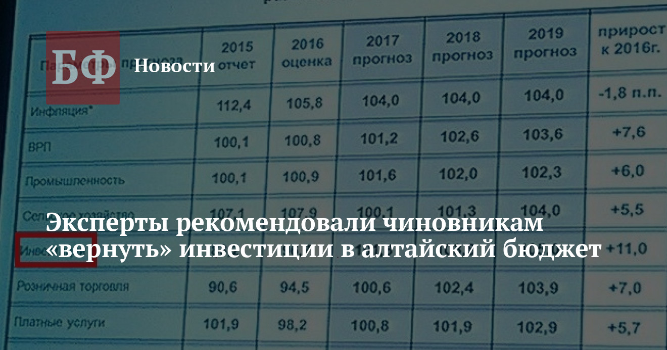 В 2016 году объем привлеченных инвестиций может составить 96,7% от уровня прошлого года, в абсолютном выражении это порядка 96 млрд рублей. Практически такая же картина (падение) наблюдается и в большинстве российских регионов, заявила замначальника ГУЭИ. Тем не менее докладчик сделала довольно оптимистичный прогноз о поэтапном увеличении инвестиций, привлекаемых в Алтайский край. Достигнуть этого, по мнению Веры Ельниковой, удастся за счет совершенствования нормативно-правовой базы, использования федеральных инструментов — Фонда развития промышленности, корпорации малого и среднего бизнеса, развития моногородов, и, в перспективе, ТОРов. Вначале прирост будет измеряться небольшой цифрой (+ 1% к концу 2017 года), но уже к концу 2019 года край выйдет на показатель в 11,2%. В среднесрочном прогнозе речь идет о приросте в 3,8% и 5% в 2018—2019 годах. Добавим, в 2015 году падение инвестиций в регионе составило 16,8%.