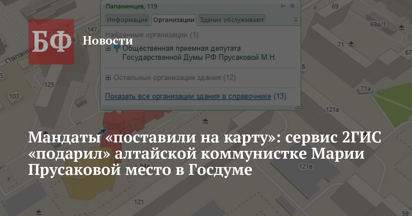 Популярный картографический сервис и справочник организаций 2ГИС, один из наиболее востребованных в Барнауле, допустил досадную оплошность во время одного из последних обновлений, фиксирующих изменения в политическом ландшафте края после выборов. При добавлении данных об общественной приемной впервые избранного депутата Алтайского Заксобрания Марии Прусаковой, компания «повысила» ее до депутата Госдумы. Данные отображены в последних версиях карт.