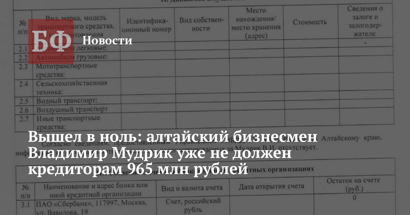 Арбитражный суд Алтайского края 6 февраля завершает конкурсное производство по делу о банкротстве известного барнаульского предпринимателя, в недавнем прошлом руководителя компании «Горизонт» Владимира Мудрика. Несмотря на то, что общая сумма включенных в реестр долгов превышает 965 млн рублей, возвращать деньги ему не придется. Из имущества у г-на Мудрика формально остались лишь доли в юрлицах, которые никому не нужны. Информация опубликована на сайте арбитража и реестра сведений о банкротстве.