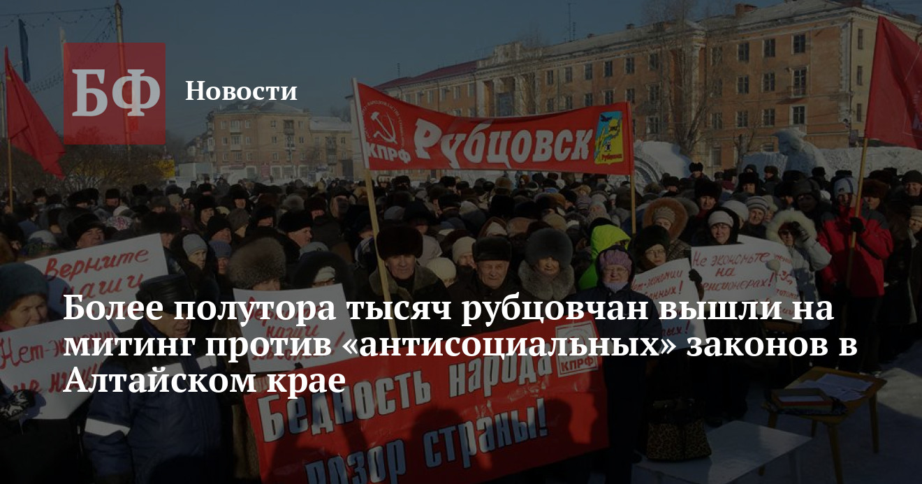 11 февраля на площади Ленина в Рубцовске состоялся анонсированный ранее митинг против принятых в регионе «антисоциальных» законов, отменяющих ряд льгот для отдельных категорий граждан. По заявлениям организаторов, на него пришли более 1500 горожан. Об этом сообщается на сайте алтайского крайкома КПРФ, выступившего организатором массовой акции.