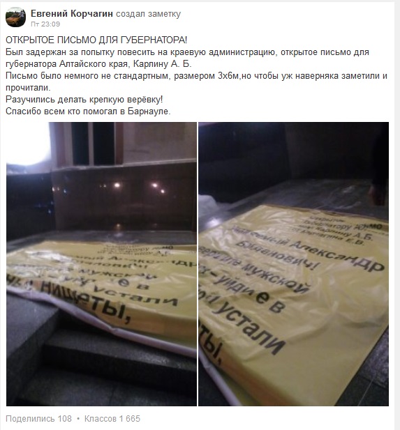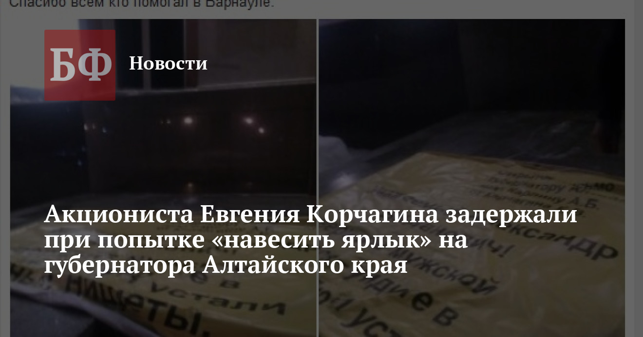 Поздним вечером 10 февраля у здания правительства Алтайского края на площади Советов сотрудники Росгвардии задержали мужчину, который пытался повесить на объект несанкционированный баннер с критикой губернатора Александра Карлина. Эту информацию ИА «Банкфакс» подтвердили в пресс-службе УМВД по Барнаулу. На странице бийского акциониста Евгения Корчагина в «Одноклассниках» содержится запись с указанием на то, что задержан был именно он.