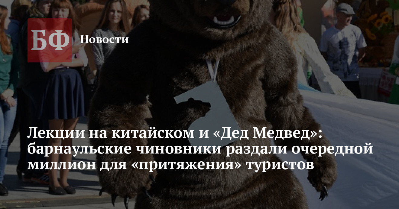 Видеостудия «Дюшес Видео» (некогда вышла из стен классического университета) займется съемками клипа «Легенда о Деде Медведе». Планируется, что в ролике главным героем станет относительно новый туристический символ Барнаула — медведь. Наконец, чиновники, которым, очевидно, очень импонирует «звериная» символика применительно к краевому центру, дадут денег на малую архитектурную форму «Медведь в Барнауле». Скульптуру установит предприниматель Дмитрий Хайлук.