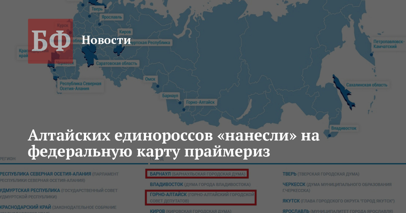 13 марта «Единая Россия» запустила обновленный сайт предварительного голосования — pg.er.ru. На одном ресурсе собраны данные об основных избирательных кампаниях текущего года. Представлены на карте Барнаул и Горно-Алтайск, где пройдут выборы в гордуму и горсовет соответственно.