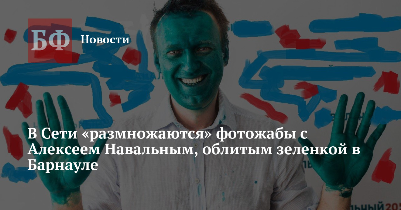В соцсетях начали появляться фотографии оппозиционера Алексея Навального, которого во время визита в Барнаул неизвестный облил зеленкой, обработанные в юмористическом ключе в графических редакторах. Инцидент имел место перед открытием его штаба в краевом центре 20 марта.