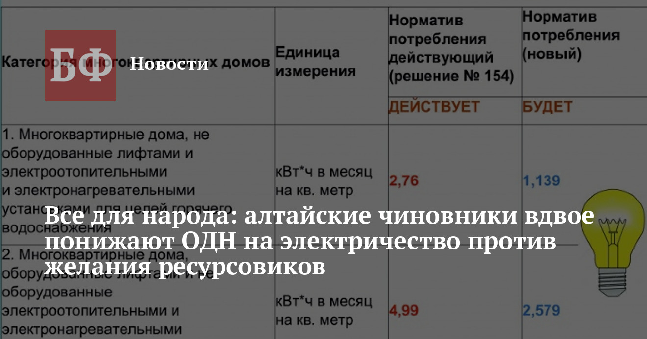 В настоящее время управляющие компании имеют право начислять жителям ОДН по фактическим показаниям приборов учета. С лета затраты на содержание ОИ могут быть предъявлены населению только в пределах норматива. Образовавшуюся разницу между нормативом и фактическими показаниями приборов учета управляющие компании или ТСЖ будут обязаны оплатить ресурсовикам из собственных средств. В начале марта на общественном совете при управлении по тарифам был представлен проект решения. Новые нормативы рассчитаны с применением методики, определенной федеральными органами и на основании данных, полученных от поставщиков электроэнергии Алтайского края — ООО «Заринская городская электрическая сеть», АО «Барнаульская городская электрическая сеть», АО «Алтайэнергосбыт», АО «Алтайкрайэнерго».