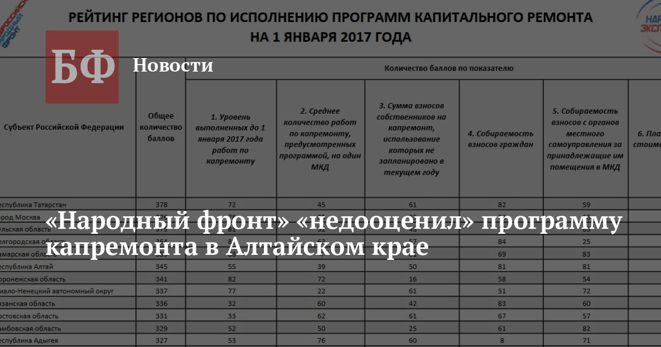 Алтайский край занял 57-ое место из 85 российских регионов в рейтинге по исполнению программ капитального ремонта за 2016 год. Исследование провел центр «Народная экспертиза», сказано на сайте общероссийского «Народного фронта».