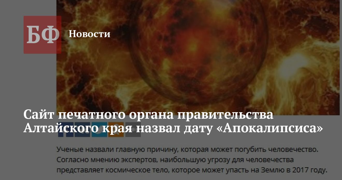 Офсайт краевой массовой, общественно-политической газеты «Алтайская правда», учредителями которой являются правительство региона и Алтайское Заксобрание, 19 апреля раскрыл дату «конца света». Как указано на сайте «алтайки», «Апокалипсис» произойдет 12 октября 2017 года.