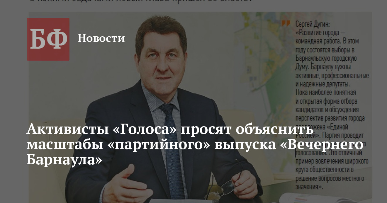 Станислав Андрейчук от имени «Голоса» обратился с запросом к главному редактору издания Михаилу Губину с просьбой разъяснить ситуацию. В том числе он намерен выяснить, как оплачивалась реклама партии и будет ли издание придерживаться политического нейтралитета — посвящать выпуски другим политическим объединениям. «Каков график выхода тематических выпусков газеты „Вечерний Барнаул“, посвященных деятельности политических партий ЛДПР, КПРФ, „Справедливая Россия“ и ПАРНАС, представленных фракциями в Барнаульской городской думе?» — сказано в запросе «Голоса».