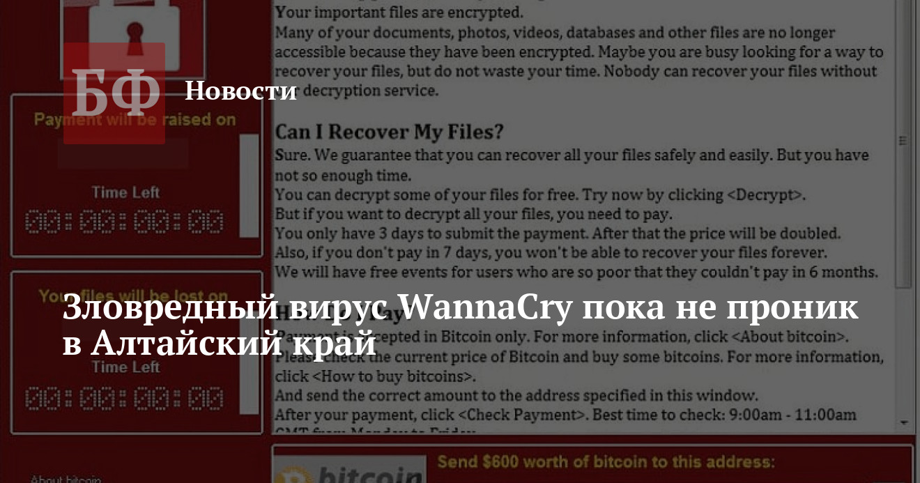 Заразивший сотни тысяч компьютеров в десятках тысяч крупнейших учреждений по всему миру вирус WannaCry (дословно «хочется плакать» — англ.) пока не оставил «жертв» в Алтайском крае. Причиной в ряде случаев стали меры защиты и своевременная реакция служб кибербезопасности.