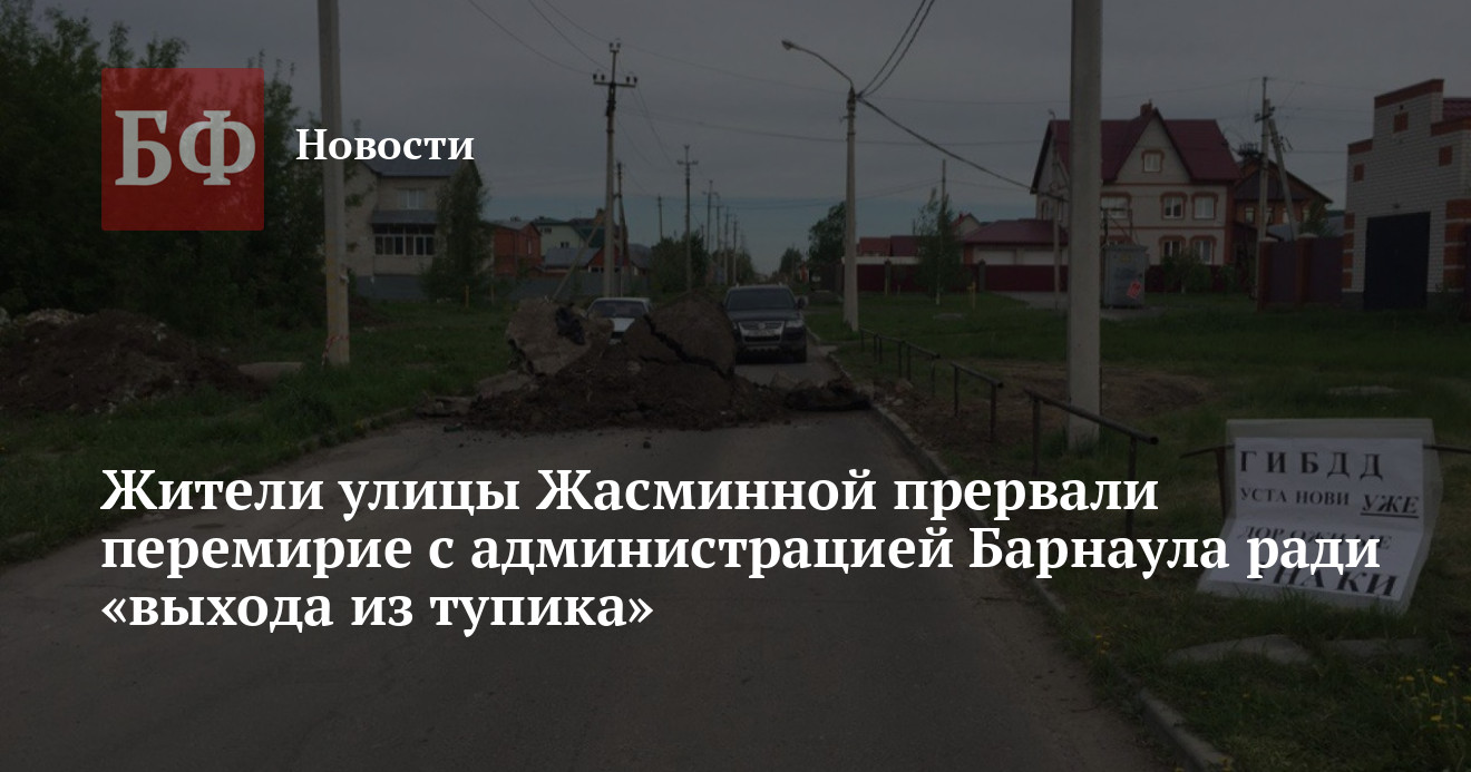 Судя по сообщению, на дорогу с помощью экскаватора или самосвала неизвестные вывалили кучу земли. Неподалеку установлен самодельный баннер, составленный из распечаток на листах формата А4. «ГИБДД, установи уже дорожные знаки», — написано на баннере. Несколькими днями ранее над проезжей частью появилась растяжка, сообщение на которой было обращено напрямую в администрацию Барнаула. «Мэр, дострой дорогу! Разгрузи, наконец-то, поселок!» — написали жители Жасминной.