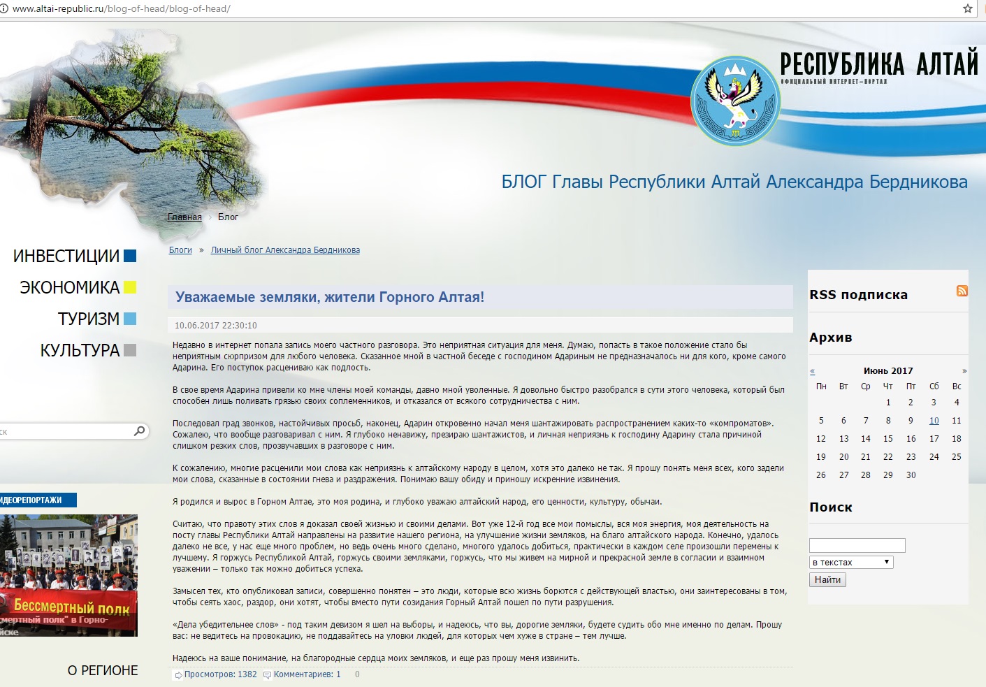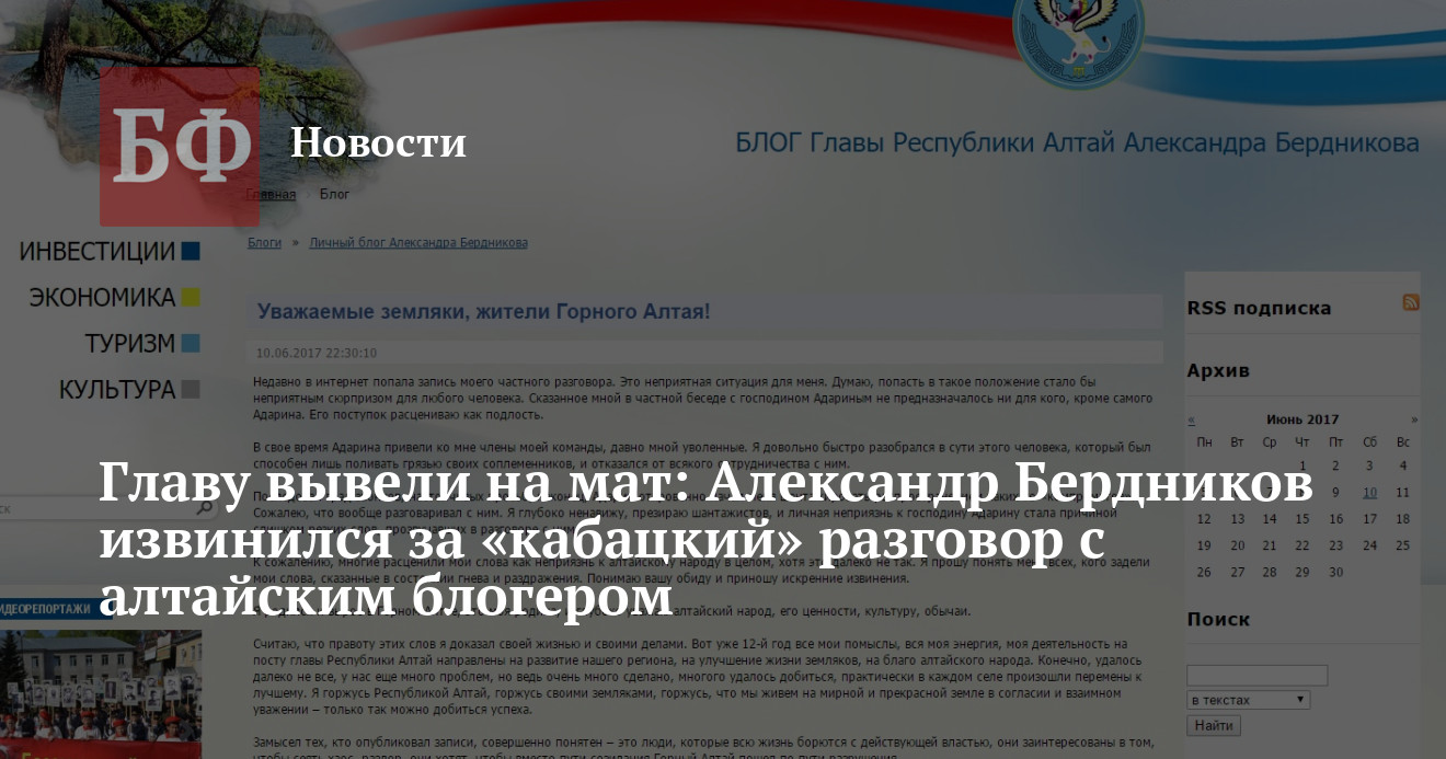 Глава Республики Алтай Александр Бердников прокомментировал обнародованную запись своего телефонного разговора с блогером Андреем Адариным, во время которого чиновник позволил себя множество крепких и двусмысленных выражений, воспринятых некоторыми представителями алтайского народа как оскорбление. В записи в своем блоге глава региона сделал акцент на недостойном поведения г-на Адарина, который опубликовал запись, но в конце все же принес извинения.