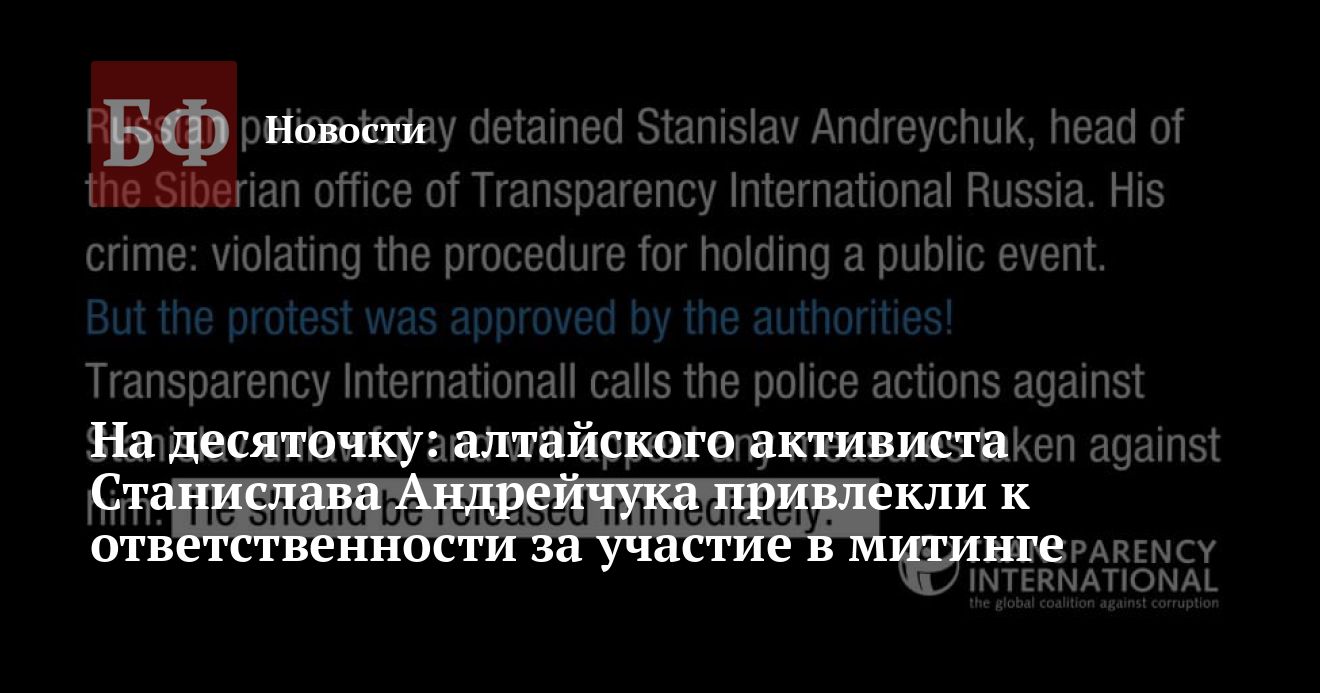 Руководитель Сибирского антикоррупционного центра «Транспаренси-Интернешнл Россия» Станислав Андрейчук, задержанный днем 19 июля за участие в несогласованном митинге против коррупции 8 апреля, получил административное наказание в виде штрафа в 10 тысяч рублей. Его коллеги из нескольких правозащитных организаций уже выразили свое мнение о незаконности этого решения Центрального районного суда и намерении обжаловать его.