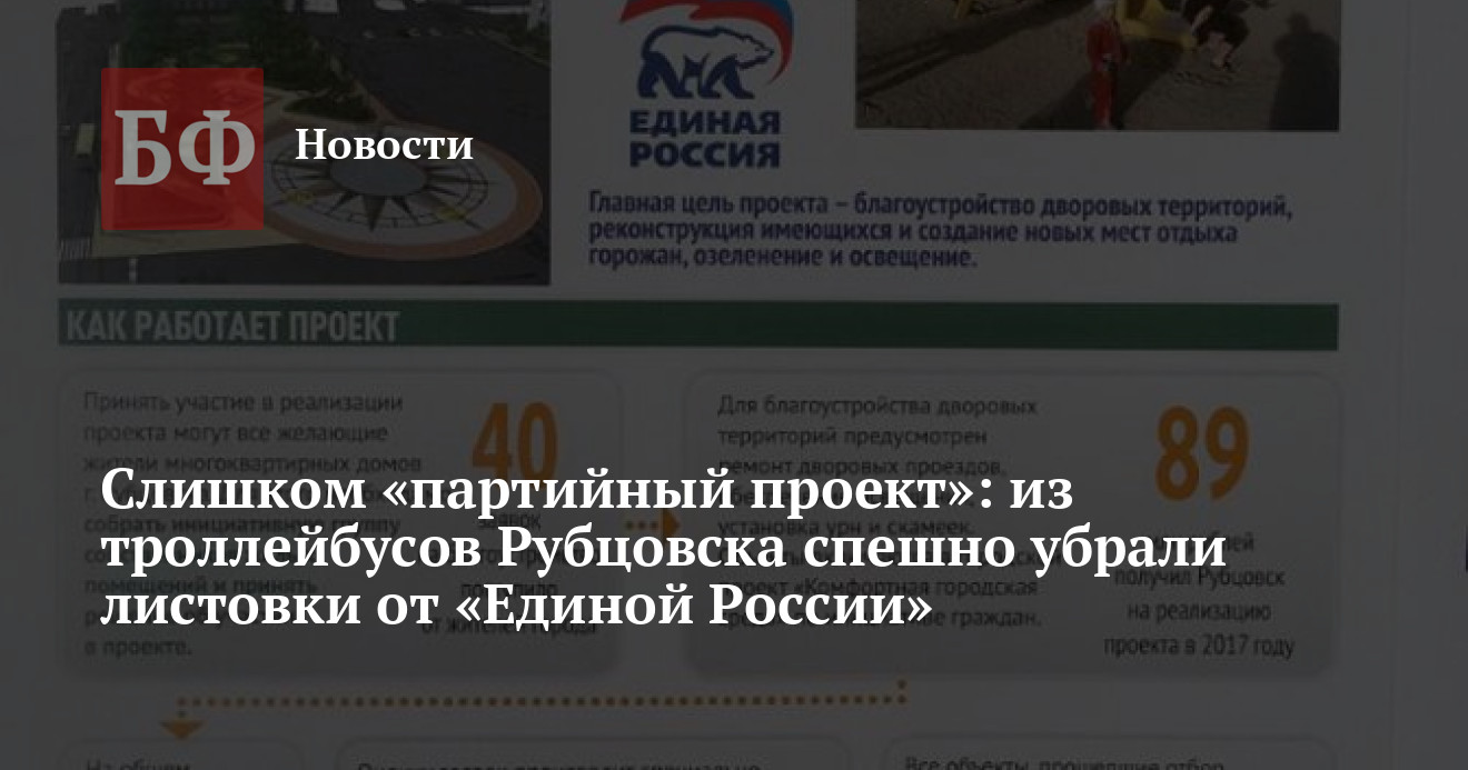Реклама так называемых «партийных городских проектов» «Единой России» исчезла из троллейбусов Рубцовска, поскольку на листовках в нарушение норм содержалась агитация кандидатов в горсовет. Для решения о демонтаже оказалось достаточно устного обращения депутата Алтайского Заксобрания Вероники Лапиной (КПРФ). В трех других похожих случаях были зафиксированы официальные жалобы в горизбирком, сообщается на сайте крайкома.