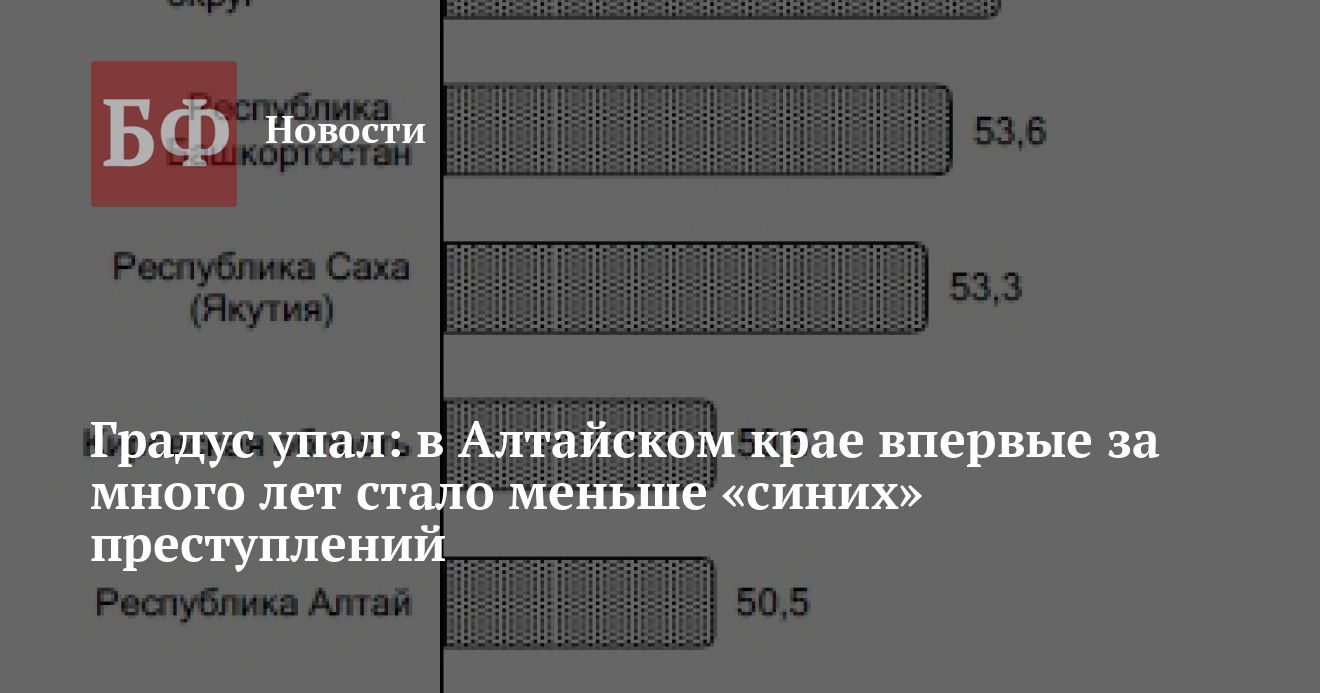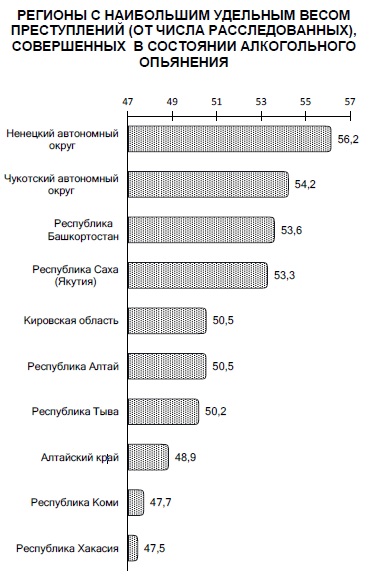 Впервые за несколько лет количество предварительно расследованных преступлений в России, совершаемых под воздействием алкоголя, уменьшилось на 14,8% (с 230 тысяч до 196 тысяч). В этот показатель внес лепту и Алтайский край: в регионе «пьяных» преступлений стало меньше на 1173. Впрочем, 48,9% всего криминала в регионе вершится под влиянием алкоголя — это восьмой результат по стране. Для сравнения, по России в среднем показатель составляет 34,1%.