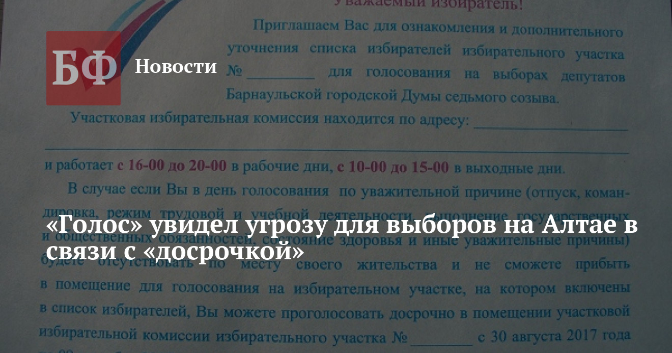 «Возникает ощущение, что избирательная комиссия, организующая выборы в Барнаульскую городскую думу, заинтересована в снижении явки избирателей 10 сентября и всячески способствует ее повышению в период досрочного голосования. В связи с этим некоторые участники выборов уже публично потребовали остановить распространение этого информационного материала и изготовить новый, с указанием даты единого дня голосования», — сказано в заявлении «Голоса». Отметим, что с подобным воззванием обратился, например, лидер алтайских «яблочников» Александр Гончаренко. К слову, глава ЦИК Элла Памфилова неоднократно заявляла, что «именно досрочное голосование на выборах в регионах является одной из самых больших потенциальных возможностей для разного рода фальсификаций». «В связи с этим полагаем, что избирательные комиссии обязаны обеспечивать возможность для досрочного голосования, но не должны заниматься его пропагандой с целью „накрутки“ явки», — настаивают защитники избирательных прав.