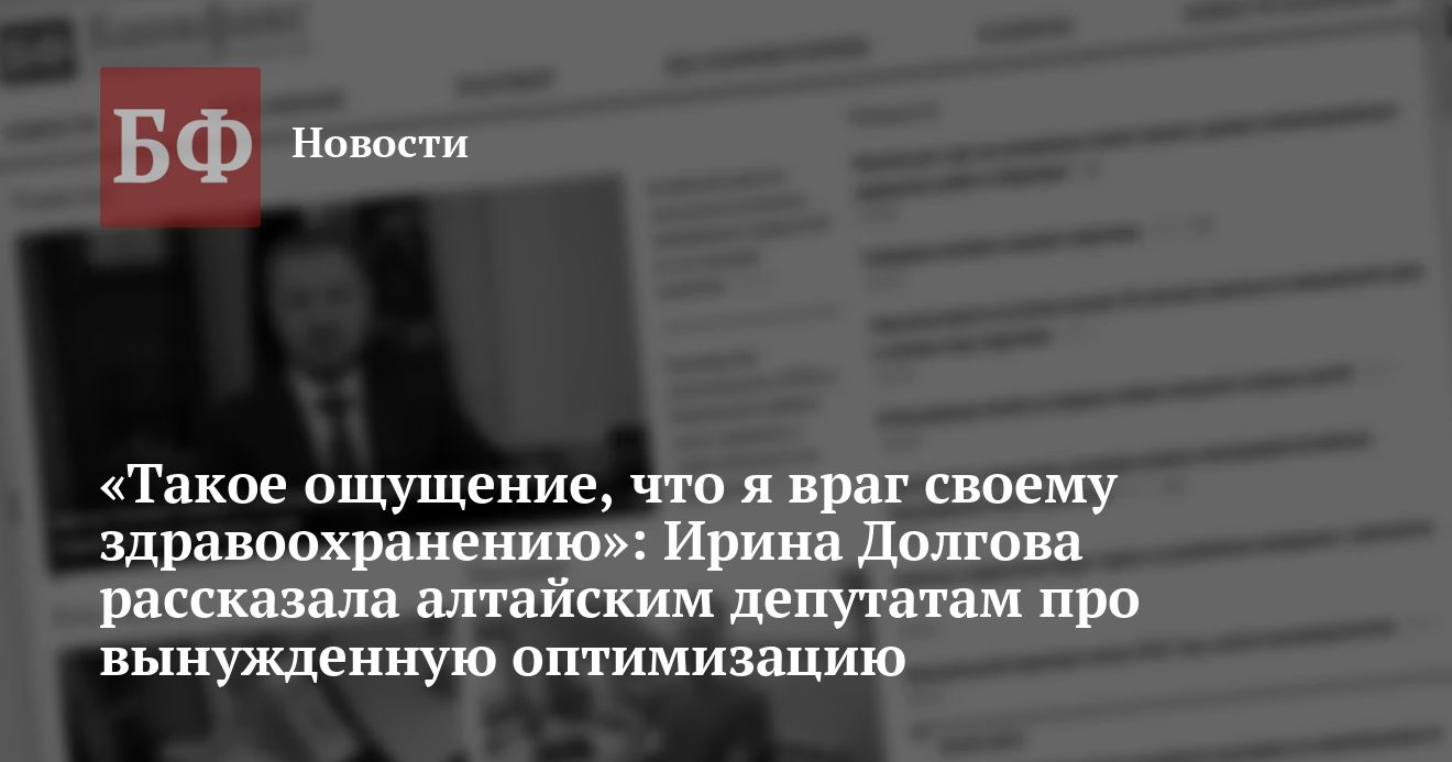 «Правительственный час» с участием министра здравоохранения Алтайского края Ирины Долговой, состоявшийся 30 августа, стал рекордным по продолжительности. Спикер полтора часа общалась с депутатами регионального Заксобрания, подробно объяснив, почему подконтрольное ей ведомство вынуждено оптимизировать медучреждения на Алтае, а также, как сокращение стимулирующих выплат медработникам должно повысить качество услуг населению.