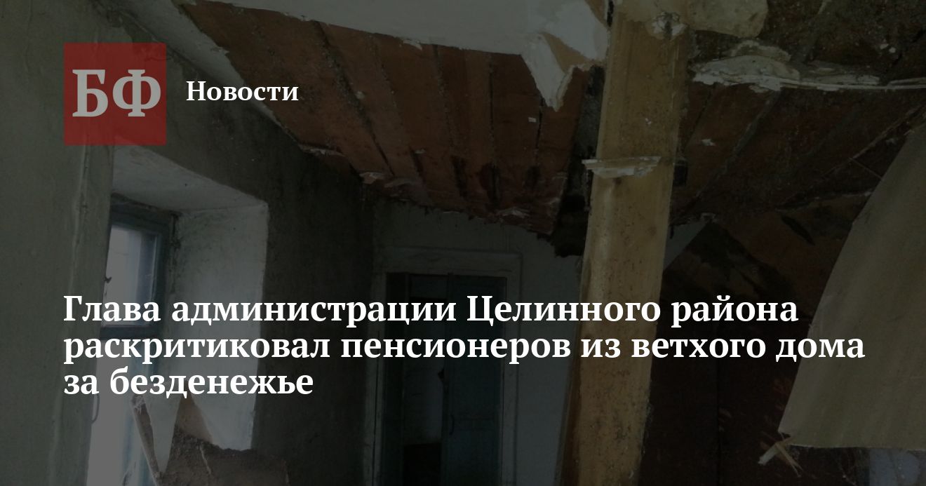 Примечательное своей простотой и откровенностью письмо от главы администрации Целинного района Виктора Бирюкова получила местная пенсионерка Надежда Бушманова. Женщина просила районные власти помочь с ремонтом обваливающихся перекрытий в старом двухэтажном доме, а г-н Бирюков в ответ посоветовал убирать с перекрытий голубиный помет и посетовал, что она «как и остальные» жалуется на безденежье. Ситуацией заинтересовались в региональном отделении ЛДПР.