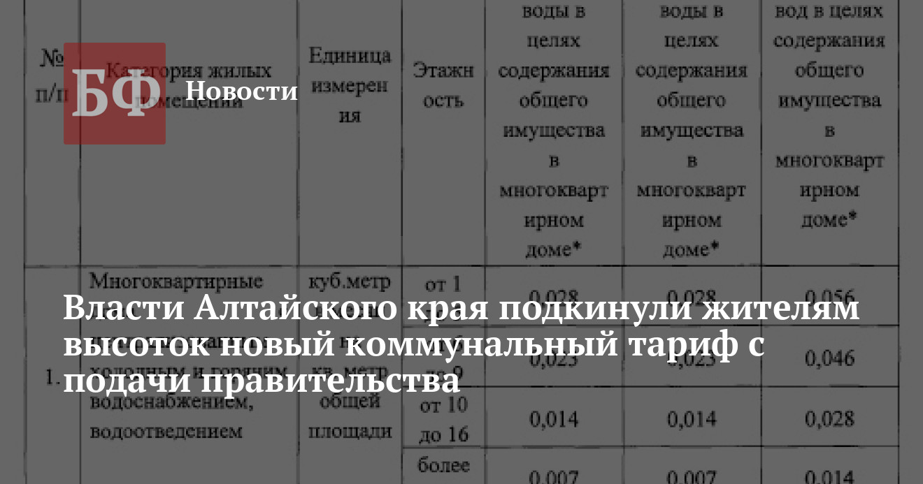 С 1 ноября 2017 года в Алтайском крае действует новый коммунальный тариф, который введен Управлением по госрегулированию цен и тарифов в соответствии с позицией федеральных властей. Теперь жители многоквартирных домов должны будут оплачивать в том числе такую услугу, как «отведение сточных вод в целях содержания общего имущества», по-простому — водоотведение на ОДН. Документ, утверждающий тариф, опубликован на сайте ведомства.