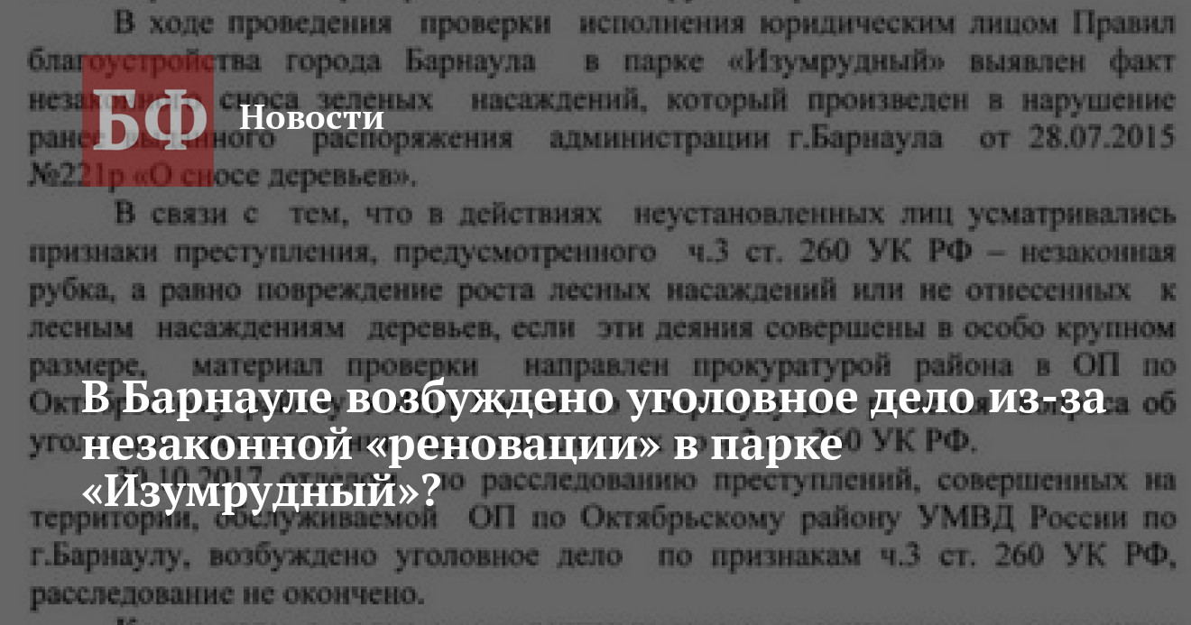 Отдел полиции по Октябрьскому району Барнаула якобы возбудил уголовное дело по факту незаконных рубок зеленых насаждений в городском парке «Изумрудный». Процессуальное решение принято после проверки прокуратуры, которая проводилась в октябре 2017 года. Об этом свидетельствуют сканы документов прокуратуры, опубликованные анонимным пользователем на специализированном форуме Skyscrapercity.