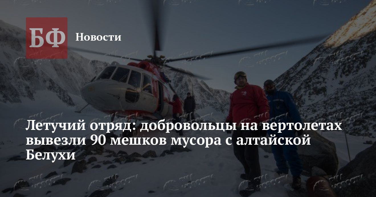 Волонтеры и любители горного туризма на вертолете Ми-8 «Авиалесоохраны» вывезли с одной из высочайших вершин России горы Белуха (4509 м) 90 мешков мусора, оставленного на ее склонах. Акция сопровождалась экстремальными трудностями, достойными голливудского блокбастера. О ней сообщает РИА «Новости» со ссылкой на учредителя благотворительного фонда «Сделаем Белуху чистой» Константина Еланцева.