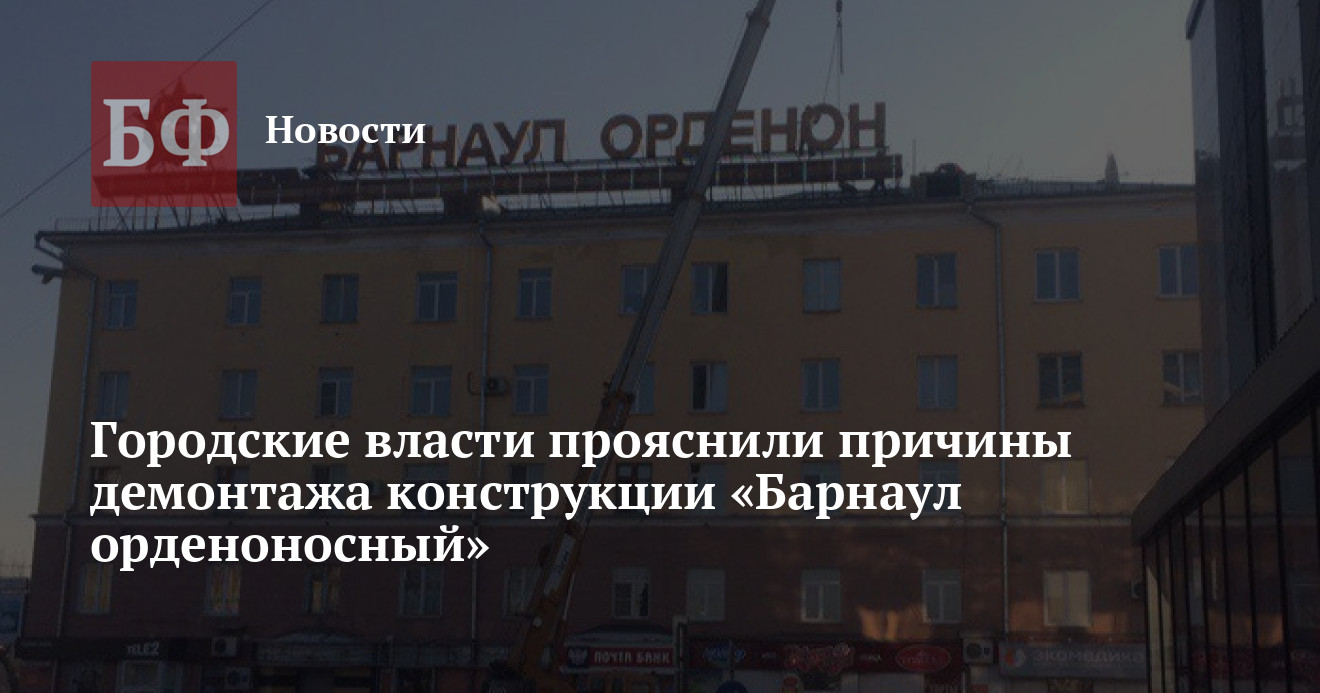 Барнаульская администрация прокомментировала вызвавшую возмущение горожан новость о демонтаже надписи «Барнаул орденоносный» на доме № 77 по улице Димитрова. Металлическая конструкция была признана аварийной — такое заключение выдала специализированная организация ООО «Алтайский центр строительно-технической экспертизы».